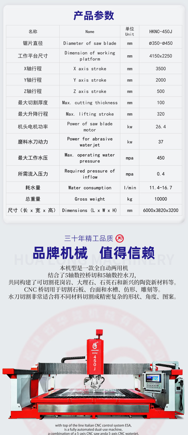with top of the line Italian CNC control system ESA, is a fully automated dual-use machine, a combination of a 5-axis CNC saw and a 5-axis CNC waterjet, which is gone together constructing the revised concept system for cutting granite, marble, quarts, limestone and the rising new ceramic material.