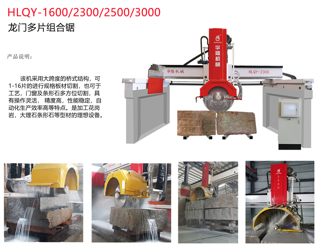 HLQY-2500 龍門多片組合鋸是一款經(jīng)典且實用的橋梁鋸,可用于將石塊切割成薄片或厚片。它采用西門子 PLC 控制系統(tǒng),配有油浸式直線導(dǎo)軌。最多可安裝 18 片薄鋸片。